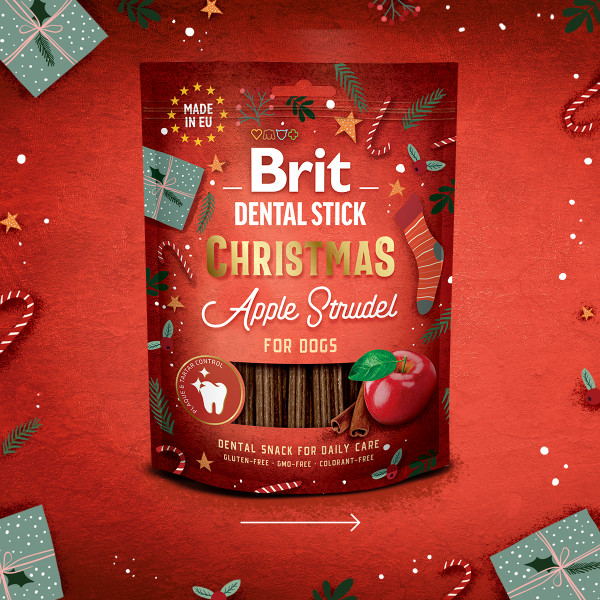 Dentální pamlsky pro psy v krásném vánočním balení. 7 dentálních tyčinek s atraktivní chutí vánočního pečení.