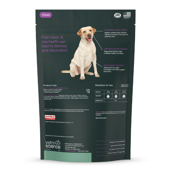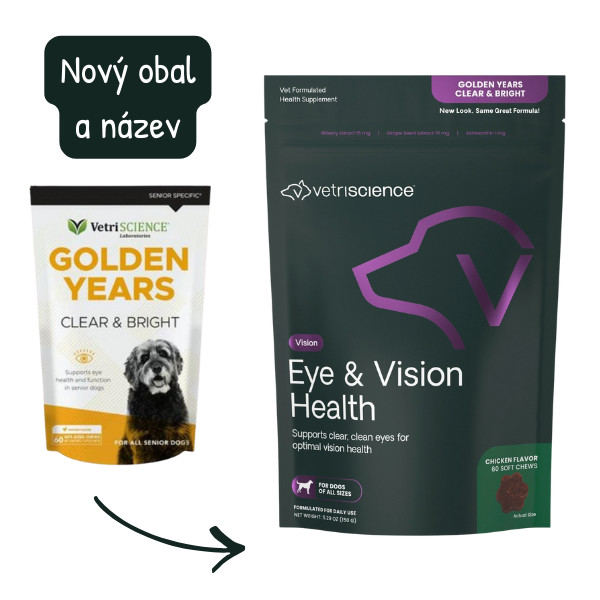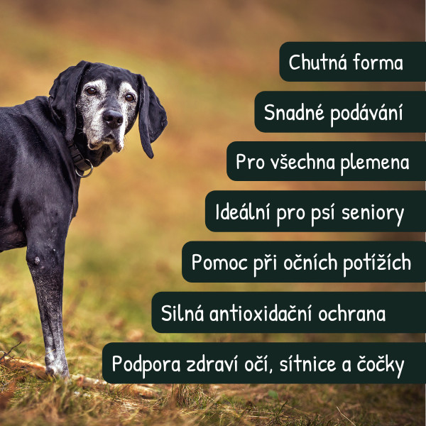 Intenzivní podpora pro oči vašeho psa. Veterinární doplněk stravy. Díky chutné formě je ideální pro každodenní a dlouhodobé podávání. Originální receptura z USA. Měkké chutné kousky pro starší psy pro intenzivní podporuju očí a zdravého zraku.