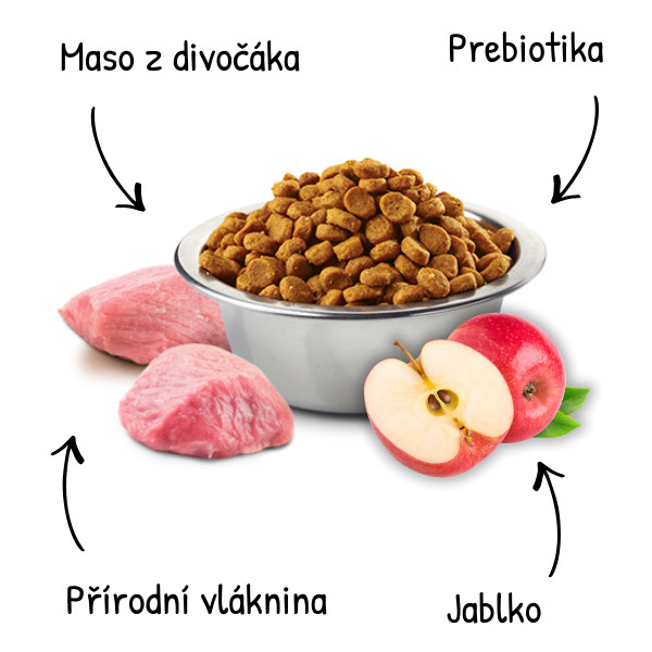Granule bez obilovin, s masem z divočáka a jablkem pro dospělé kočky.