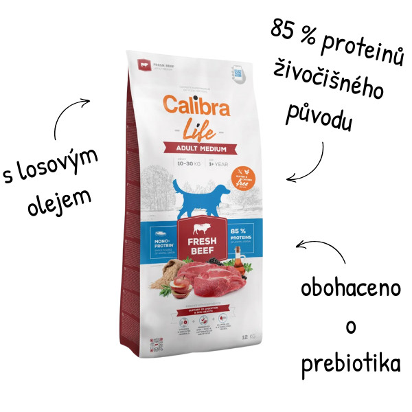 Granule s čerstvým masem pro dospělé psy středních plemen (10-30 kg). Receptura s hovězím a rýží obsahuje čerstvé hovězí maso s vynikající výživovou hodnotou a skvělou chutností. Zcela bez kuřete - neobsahuje ani kuřecí maso, ani kuřecí tuk!