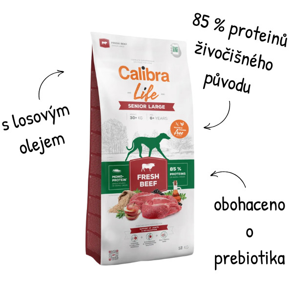 Granule s čerstvým masem pro starší psy (6 a více let) velkých plemen (nad 30 kg). Receptura s hovězím a rýží obsahuje čerstvé hovězí maso s vynikající výživovou hodnotou a extra chutností. Receptura je zcela bez kuřete (neobsahuje ani kuřecí maso, ani kuřecí tuk).