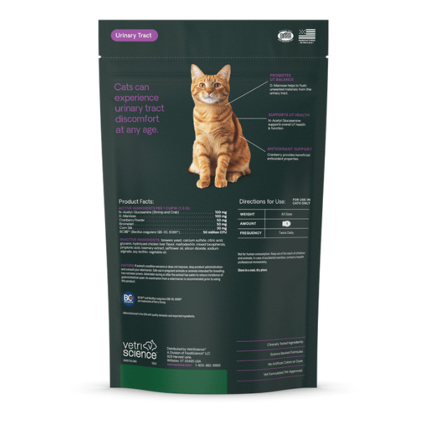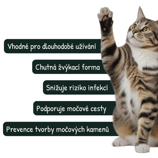 Intenzivní podpora močových cest pro kočky. Veterinární doplněk stravy vhodný i pro dlouhodobé každodenní podávání. Měkké kousky na podporu zdraví močových cest pro kočky, které mají predispozice k tvorbě močových kamenů. Díky chutné formě je ideální pro každodenní a dlouhodobé podávání. Originální receptura z USA.