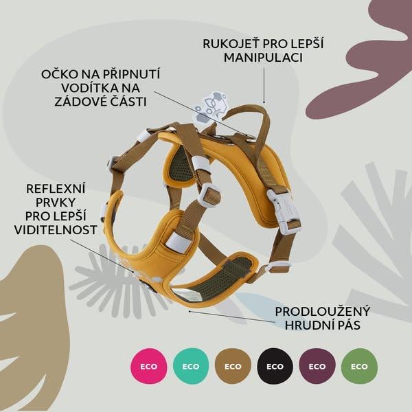 Ergonomický postroj pro aktivní psy. Univerzální postroj, který zvládne každodenní procházky i náročnější výlety. Díky pevnému, ale měkkému provedení se hodí pro každodenní nošení na běžné venčení, výlety i volný pohyb. Postroj dobře rozkládá tlak, takže je ideální i pro dlouhodobé nošení.
