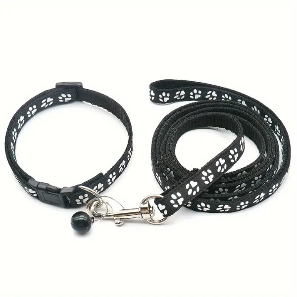 Sada obojku a vodítka pro štěně v černé barvě s motivem tlapek. Praktická sada pro štěně pro první procházky i výcvik. Nastavitelný obojek 19–32 cm se šířkou 1 cm padne na každé malé štěňátko a roste spolu s ním. Pevné vodítko s délkou 120 cm zajistí kontrolu a bezpečí. Odolný a snadno omyvatelný materiál pro dlouhou životnost.