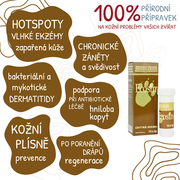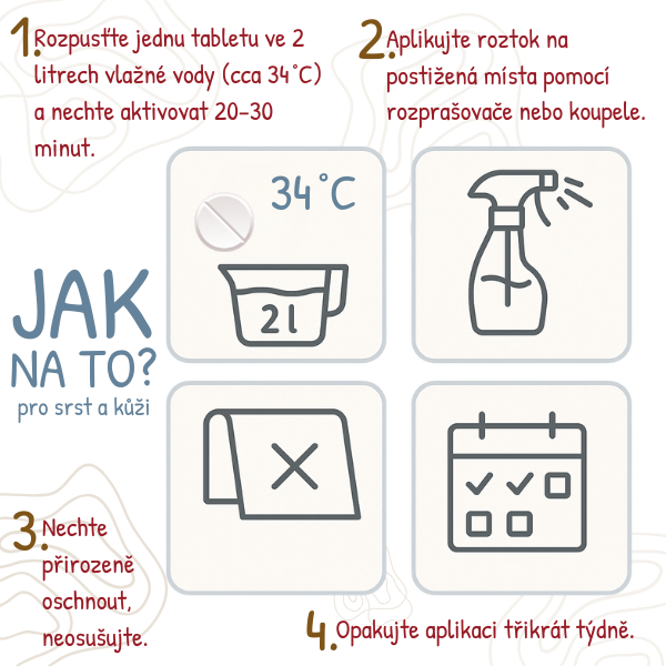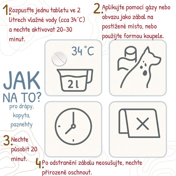 Veterinární přípravek na kůži při výskytu kvasinek, plísní nebo jiných kožních obtíží. Pro psy, kočky, koně a další zvířata. Tablety s obsahem chytré houby pro přípravu roztoku na vnější použití.