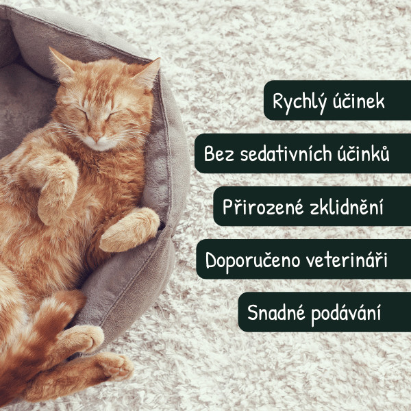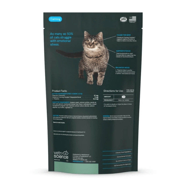 Rychlé zklidnění pro kočky (viditelný efekt již do 30 minut). Veterinární doplněk stravy. Díky chutné formě je ideální i pro každodenní a dlouhodobé podávání. Originální receptura z USA. Měkké chutné kousky s uklidňující recepturou s rychlým nástupem účinku. Pro kočky vystavené zvýšenému stresovému prostředí (návštěva veterináře, cestování atp.)