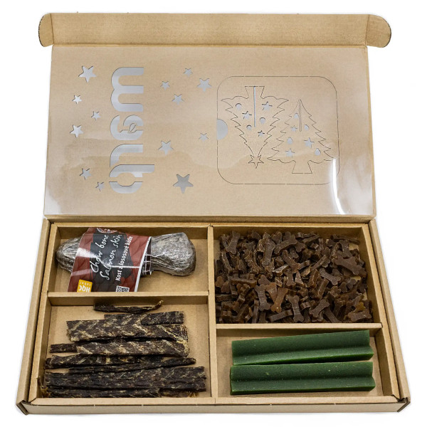 Vánoční pamlskový box - stylový dárkový balíček pro psy všech plemen, který pod stromečkem potěší každého čtyřnohého parťáka.