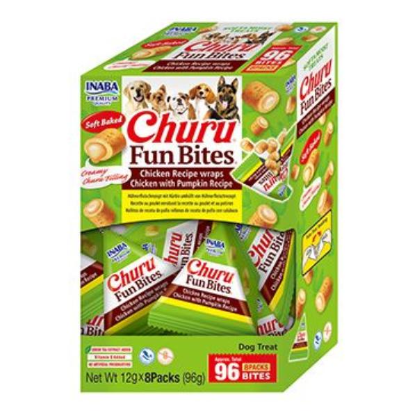 Doplňkové krmivo pro psy, Churu Fun Bites jsou lahodné polštářkovité pamlsky s jemným krémovým středem, které kombinují měkkou texturu s neodolatelnou chutí. Jsou z kvalitních surovin, jako je přírodní farmářské kuře a dýně, neobsahují obiloviny.