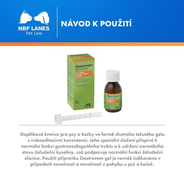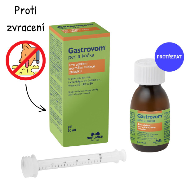 První pomoc proti zvracení pro psy a kočky všech věkových kategorií. Podává se při nevolností všech typů (zvracení při nemoci, při podávání léků atp.). Účinkuje také při nevolnostech spojených s cestování či stresem (zvracení v autě). Obsahuje guarovou gumu, kaolinitové jíly, L-alanin, vitamíny B1, B2 a B6. Pro podporu normální funkce žaludku.