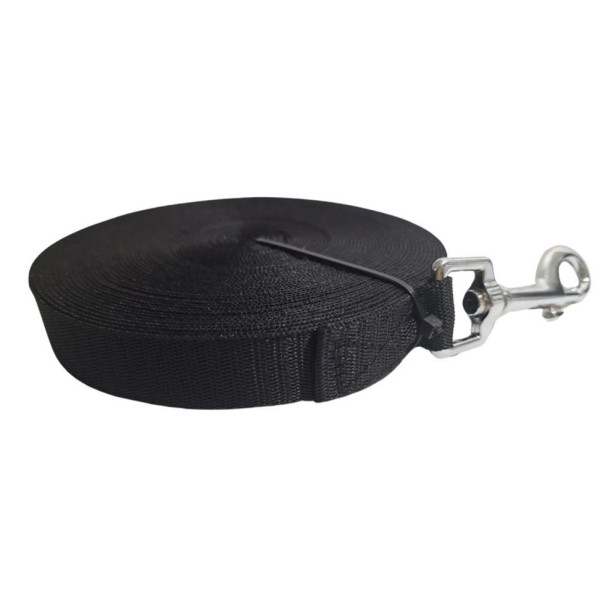 Černé stopovací vodítko z pevného českého popruhu, šířka 20 mm. Kvalitní karabina (cca 76 mm), vhodné pro výcvik a bezpečný nácvik přivolání. Doporučeno pro psy do ~23 kg (při plném záběru). Česká výroba.