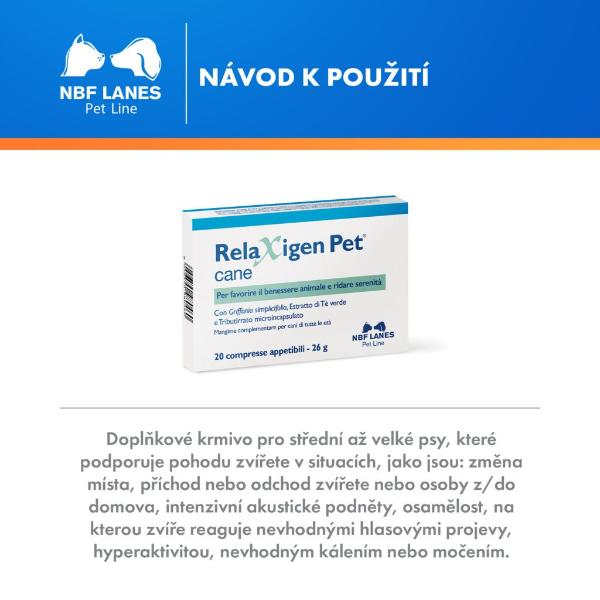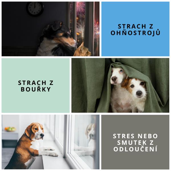 Pro rychlé zklidnění psa ve stresových situacích. Strach z ohňostrojů, bouřek, nervozita z ošetření u veterináře či v salonu, třes a zvracení při cestování, úzkost ze samoty (pes, který doma vyje, ničí věci a nesnese být sám). Vhodné i pro štěňata či psy z útulku nebo pro pejsky, kteří ztratili páníčka nebo psího kamaráda při zvykání v novém prostředí či zvykání na těžkou situaci. Chutné tablety.