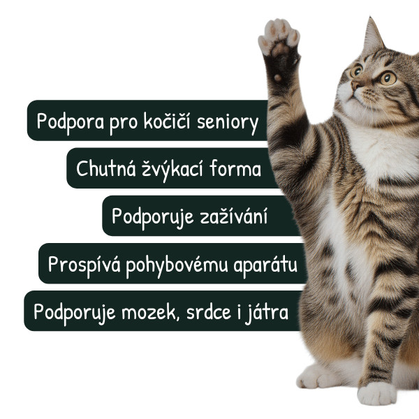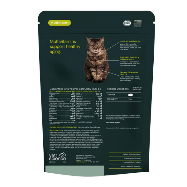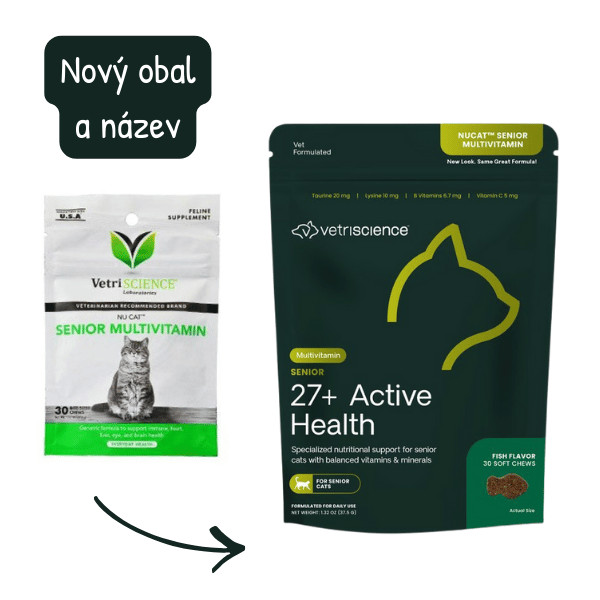 Multivitamínový komplex pro stárnoucí kočky. Veterinární doplněk stravy, který je chutný a vyvinutý na míru potřebám kočičím seniorů a geriatrickým pacientů. Veterinární doplněk stravy. Díky chutné formě je ideální pro každodenní a dlouhodobé podávání. Originální receptura z USA.