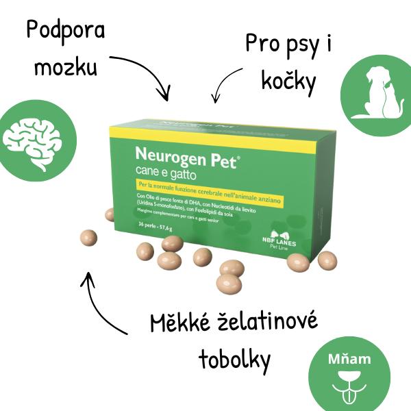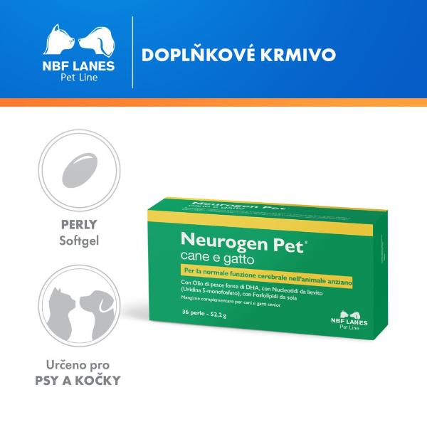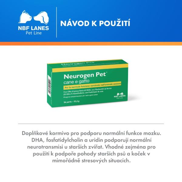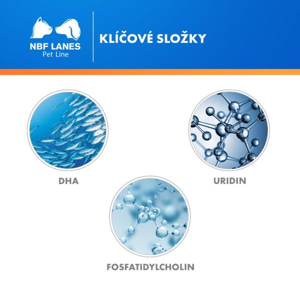 Doplňkové krmivo pro psy a kočky seniory s obsahem DHA z rybího oleje, nukleotidů z kvasnic (uridin-5-monofosfát) a sójových fosfolipidů. Pro podporu normálního fungování mozku starších zvířat.