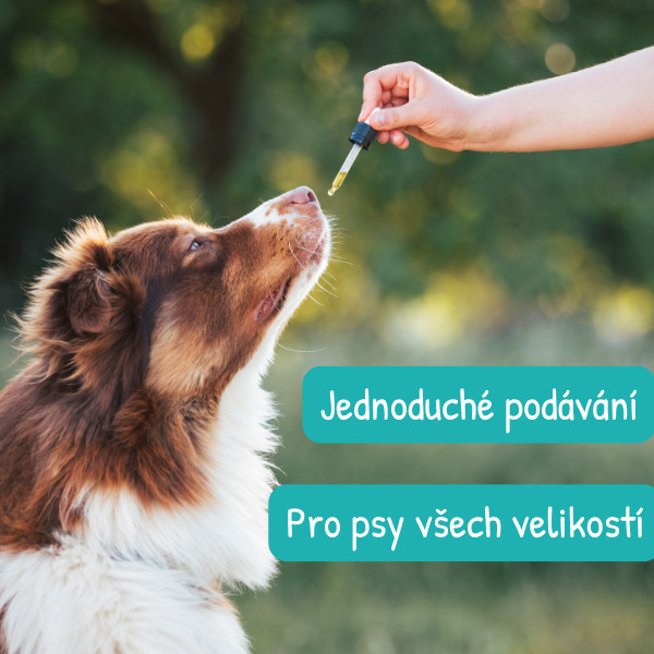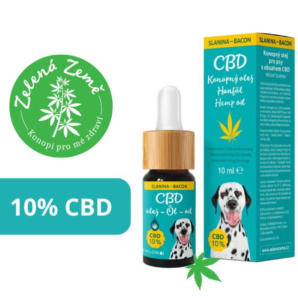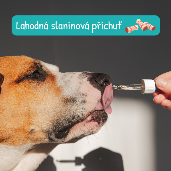 Konopný olej s obsahem CBD se slaninovou příchutí pro psy. Pomáhá ulevit od bolestí, při epilepsií, alergiích, úzkosti či stresu (bouřky, ohňostroje, cestování).